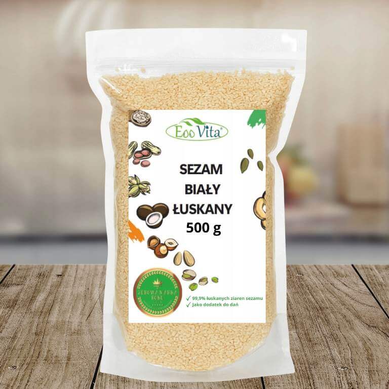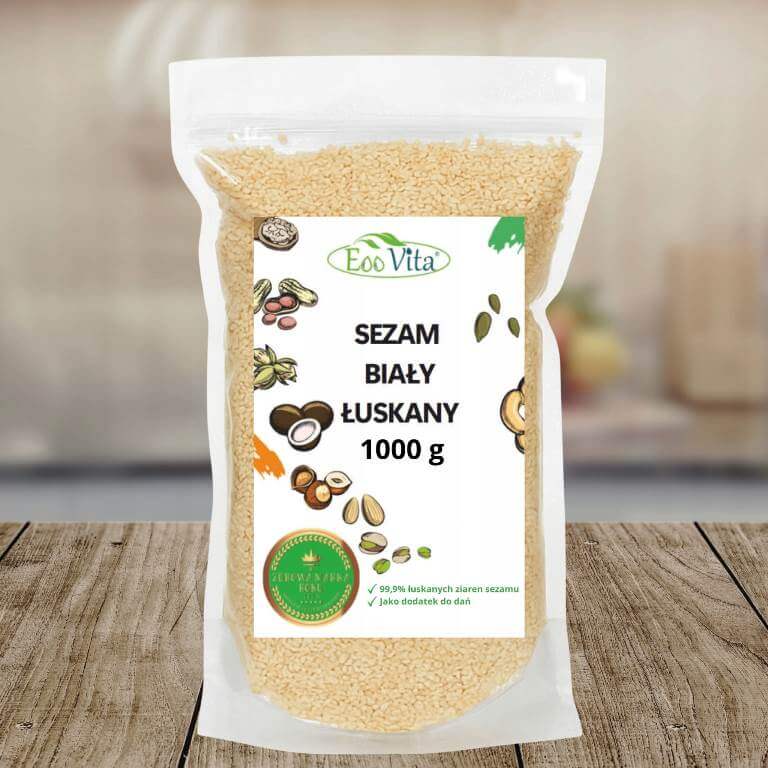 Sezam biały łuskany to drobne, jasne ziarna o delikatnym, lekko orzechowym smaku. Doskonale sprawdza się w pieczywie, wypiekach, daniach wytrawnych oraz smoothie. Dostępny w opakowaniach 200 g, 500 g i 1000 g.