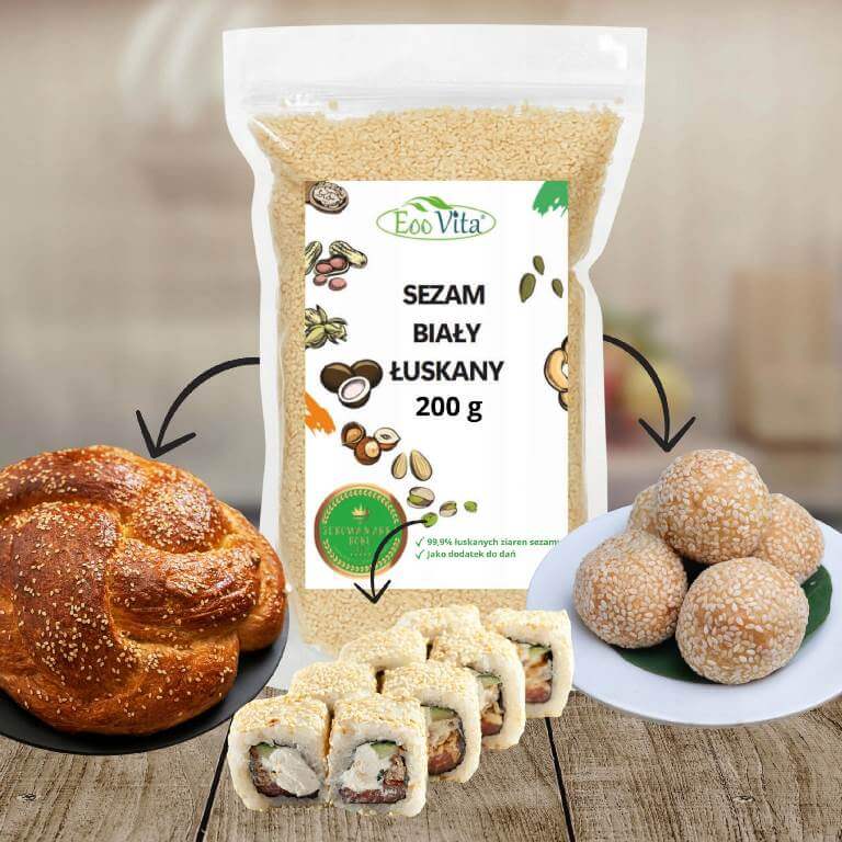 Sezam biały łuskany to uniwersalny produkt, który z powodzeniem można wykorzystać w wielu przepisach. Dzięki łuskanej formie ma delikatniejszą strukturę oraz subtelniejszy smak, dlatego dobrze łączy się zarówno z suchymi, jak i mokrymi składnikami. Co więcej, jego drobna postać ułatwia równomierne rozprowadzanie w potrawach.