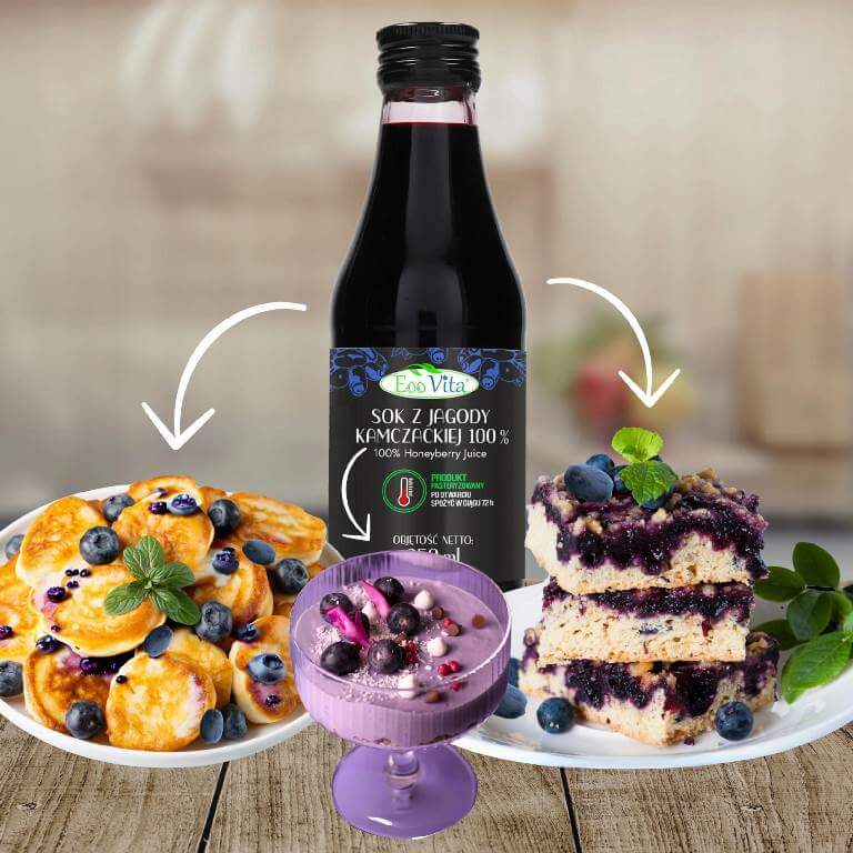 Sok z jagody kamczackiej sprawdzi się zarówno w codziennych przepisach, jak i w bardziej rozbudowanych kompozycjach. Można go wykorzystywać na zimno, a także jako składnik podgrzewanych sosów owocowych. Dzięki wyrazistemu smakowi dobrze łączy się z kakao, wanilią, jogurtem naturalnym, napojami roślinnymi oraz deserami na bazie śmietanki lub serka.